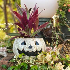 むかーし100均で買ったハロウィン🎃の鉢がオレンジとイエローで派手で好みでなかったので、白くヌリヌリ🖌️(デコボコベースを使いました) 茶色の塗料でまたヌリヌリ🖌️可哀想だけど汚しました🤣 ムラサキオモトを入れて髪も爆発😆 庭がだんだん怪しくなって楽しいなー🎵🤣