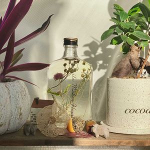 おはようございます☀️ ①②ウイスキー🥃の空き瓶でシンプルなハーバリウムを作ってみました♡ 大人になるのも悪くない🥃🫙😆😂🤣 中は使わなくなって処分に困っていたクレンジングオイルです😂🤣 ③コロカシアに日が差して✨赤く綺麗に透き通っていたので❤️人形を置いて遊んでみました♪大人か?🙄 影が。。想像と違って別人やん😀🤣 ④昨日のフェイクリースと正反対すぎる、剪定した枝だけを丸めたナチュラルリース🌿 極端ー🤣 掛けてあった色褪せたラベンダー🪻🤭の上に引っ掛けました。 もっと🌿足してリースっぽくしようかと思ったけど、崩れそうだし、面倒だから。。はい、やめました😝 なかなか理想のリースは出来そうもありません😂
