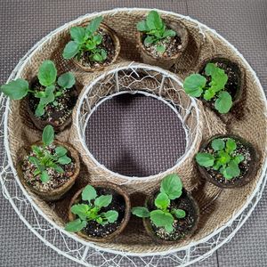 おはようございます👋😃 9月16日、ジフィーポットに種蒔きした『 虹色スミレ』。 リース台に定植。少し大きくなりました。やっと蕾がついてきて😍心を鬼にして、蕾摘み取りました。大きくな~れ🪄。 ジフィーポット蒔きの苗は、定植簡単です✌️リングバスケットに高さピッタリ。根元に水苔置いて、スタンドにかけてみました😊どんな色が咲くのか🤔楽しみ~🎶 (2022/12/13)