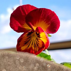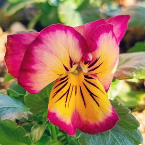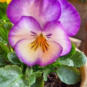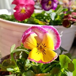おはようございます👋😃 種蒔きからの虹色スミレ。2種類めの開花は、虹色スミレ メープル⁉️中心部は鮮やかな黄色。周囲は赤(朱色⁉️)。 中心部のヒゲのようなライン(正式名称は何🤔)がクッキリな可愛い花です😊 ⚠️パンビオの斑紋や斑点は、ブロッチと言うそうです。(Okavangoさんに教えていただきました🙏💦💦感謝)。 これは初めて使う吊り下げタイプの“ラブリーバスケット”に植えた物。周囲のスリット部分には、デイジーを植え、上部に虹色スミレを植えてます。 (2023/1/11撮影)