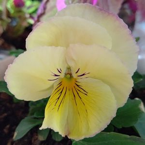 おはようございます👋😃 虹色スミレ、3種類目の開花はレモンイエローの花びらに、ほんの少し覆輪が薄紫色。ブロッチ薄め。品種は⁉️ (金曜日の蕾たち投稿のもの) スイートラブ⁉️ラブリームーン⁉️エンゼルピンクも候補⁉️判別難しい😣 (2023/1/14撮影)