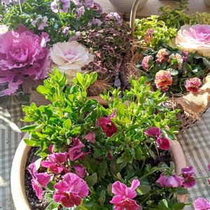 おはようございます👋😃 ➡️10月に作った、ビオラのスリットバスケット。毎日お花モリモリ😊 ⬅️9月16日に種蒔きした、虹色スミレのリングバスケット。9苗のうち7つが開花。これから、もっともっと沢山の花を咲かせてくれるはず😊 晴れた🌞日は南側ベランダに。雨☔️の日、お客様の日だけ北側玄関横の窓に。 パンジー・ビオラの耐寒性に感謝😆💕✨ (2023/1/29撮影)