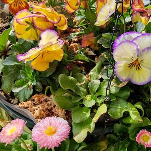 ラブリーバスケットが可愛い💕、というだけの記録📝です😊 種蒔きからの虹色すみれと、デージー タッソーピンクが花盛り。サイドのスリット部分に植えたデイジーも、みんな上を向いて咲いてます🎶 土は、ハンギング用の軽量タイプを使うこと⚠️、普通の土で植えて重い😱 今日は特定健診受診で朝食抜き😂お腹空いた~🤣 (2023/3/17)
