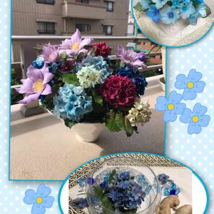 おはようございます☔️☔️ 昨日の大雨☔️☔️ 皆様の地域に被害がない事を 祈ります こちらも真夜中に強い雨音で 目が覚めてしまいました 昨日は一歩も外に出なかったので 💙今日は私の作品で失礼します 下の⤵️紫陽花は30年?前に 初めて作った物です💙 クレマチスと紫陽花は 今お友達の歯科医院に あります (私のお気に入り)