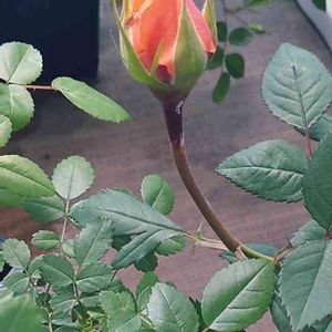 コルダナのミニバラ 朱色?オレンジがかった色です ステムがどんどん伸びて細目なので重そう… 花が咲いたら下向いちゃうかな