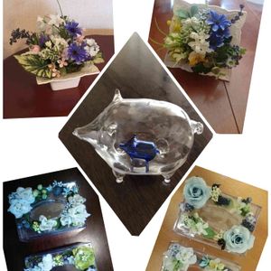 🥀アートフラワー こんな講習会もやりました 🌸ポケットティッシュケース 🥀額アレンジ 立てた人 横に置いた人 真ん中のブタ🐷さん可愛い💕 ガラスのブタ🐷の中にブルーのブタさん🐷が 🦋🧢💍美しき青きドヨウ🦋💍🧢