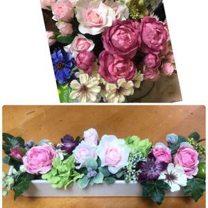 🥀お花の問屋さんでアートフラワーを 買って来ました 春色ばかり 家の中は春になりましたヨー🌹🌼 🌸昨日は試作品 テーブルのセンターに 置くお花を作ってみました🌺 お花を生けていると時間を忘れますネー ♡╰(*´︶`*)╯♡♡♡ルンルン♪