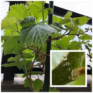 🍇シャインマスカットの葉や新しく出た蔓に付いてる 丸くて透明なものは何かな⁉️ もしかして虫の卵⁉️ 追記 解決しました😊 とんだ早とちりで たーぼーさんに聞いちゃったよ〜😅