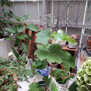 連投失礼します。🙇💛 梅雨を楽しもう投稿No.2🌟 今月お迎えしたシャインマスカットの苗です。🍇💜スリット鉢に植え替えた後はほったらかしですが成長してる~。q(^-^q)ヤッター実がつくまではかなり時間がかかりそうですが憧れのグリーンカーテンまで頑張りま~す。ヽ(^∀^*)ノ🎵 雨が止んだ隙にテラスへ連れてきてミニ薔薇グリーンアイスの枯れた葉や黄色い葉をチョキチョキお手入れです。うどん粉病の蕾もチョキチョキ。✂✨雨の日でもなんかやらねば気がすまないですよね~。🌿🌿🌿💚