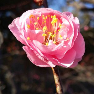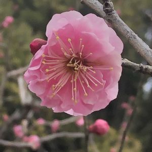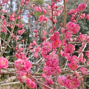 今日は良いお天気です。☀️ 万博公園の梅林にて、ピンク色の梅「八重寒紅」をパチリ!📸🌸😊😄🌞✌️
