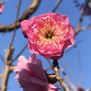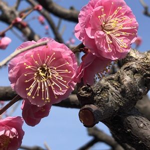 青空の下、ピンク色の梅「八重寒紅(やえかんこう)」が映えます。📸💙🩷😄🤗🌞✌️