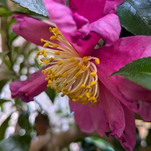 おはようございます😃 サザンカが咲いています。💕 もう少し早く気がつけば良かった!😅 もう花びらが散ってるのもあります。 木の上の方に咲いていて間からやっと撮れました。💓💖🩷 蕾もあるので毎日見て見ようと思います。🤗