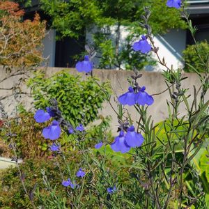 ❇️サルビア·アズレア 宿根草のハーブ🌿 爽やかな💙スカイブルーの花を輪生状に、咲かせてる。 別名:スカイブルーセージ :プレーリーセージ 花の名前、花友さんに教えて頂きました。アズレアとは、英語で「空」を意味することも。ありがとう‼️ 散歩道で。白いランタナと同じく、畑の回りに植えてあり、青紫の可愛い花💕 風が強く、高さもあったので、大きく揺れて撮影に苦労した😅