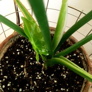 セロームさん日光浴~ ポトスさん葉焼けを気にしながら日光浴~(^^) 家のセロームさん葉っぱの溝が浅いのだけれど…なんでかな?