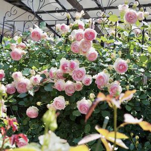 ミニバラ グリーンアイス 年々パワーアップして、7号鉢から花が爆発しました😆💕 枝がかなり伸びて、ツルぽいですね 幅をとるので、支柱にまとめました。