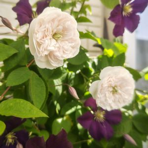 今朝のマダム アルディ🤍💜 クレマチス エトワールバイオレットと一緒に咲いています✨ よくお似合いね👩❤️👩💕