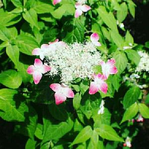 ヤマアジサイ アマチャ 若葉をお茶にして飲めるアジサイ(の変種らしい)。 我が家ではお花を見たいので滅多に葉を取りません。 お引越し前に育てていたものは水色っぽいお花が咲いていましたが、お引越し後に新たに迎えたこちらはピンクのお花が咲きました。 ペーハー測ったこと無いですけど、アマチャも環境で色が変わるんでしょうかね。 それとも株の個性かな。 【追記】 アマチャと一口に言ってもいくつか種類があって、その違いによって花色のみならず、ガクの形、株の特徴も少しずつ違うらしいです。
