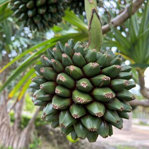 ビヨウタコノキ (美容蛸の木、美葉蛸の木) タコノキ科 直立した幹から蛸足状の気根を出す熱帯性の常緑広葉高木です🐙 この気根は幹を支えているので支柱根と呼ばれます💚 雄株と雌株がある雌雄別株で 雄株は穂状花序を伸ばし たくさんの白花を下向きに咲かせ垂れ下がります🤍 雌株は淡緑色の雌花を咲かせ 果皮が尖ったパイナップルような🍍集合果を付け🍍 やがてオレンジ色に熟します🧡 細長く美しい葉の葉縁には小さな赤色の棘があります‼️ 名前の由来は 支柱根が蛸足に似ていて🐙 ビヨウとは✨タコノキの中で一番美しい(特に細長い葉が)ということから名付けられたとか⁉️ 鹿児島県奄美市笠利町"奄美パーク"の"一村の杜"で たくさん見かけました🤳