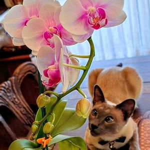 ミディ胡蝶蘭 半年ぶりに美しく開花しました。 撮影していたら やっぱりビバーチェ😻🐾 お邪魔むし〜👀❗ お花を眺めにきたのかな⁉️ 立派な大きめの花が咲いて とってもうれしいです🥰🥰 5枚目はまた別の胡蝶蘭 これは3本の花芽が出ています。 花芽,これ以上伸びないのかな〜⁉️