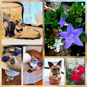 22日はニャンニャン祭り😻🐾 真夏のビバーチェ 人前ではおすまししてますが このうだる暑さの中🔥 実はかなりダレています🤩✌️ 2枚目 もう3.8kgもある大人なのに 小さなガラスのボウルに 無理やり入ってガタンゴトン おシッポ抱え込み舐め〜😨 ピアノの大屋根の上でもソファでも ダイニングテーブルでも ダレて甘えてクネクネ〜👀❗ お庭では サンパラソルの情熱の赤いお花の隣で キキョウはとっても涼やかなのにネ🥰