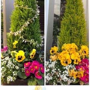 職場のお花だより 昨年11月に寄せ植えしたゴールドクレスト ファミリー🌸💕 施設玄関両脇で(一対)お客様を笑顔で^_^ お出迎えしてくれています。 クリスマスには🎄ディスプレイして クリスマスツリー🎄になったり 今はファミリーそれぞれが (フリルパンジー、ジュリアン、アリッサム、ガーデンシクラメン) 冬の寒い時期を乗り越えてくれて☃️ いっそう逞しくなり💪お花を沢山咲かせてくれています。🌸🌸🌸🌸💕 大所帯ですので水枯れしないよーに 頑張りますので…。 これからも宜しくね〜💪🎶
