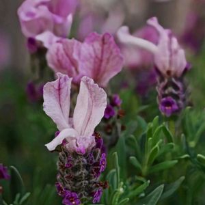 🍀フレンチラベンダー🍀(ストエカス系)は、ウサギの耳のような苞葉が特徴で、花色も紫、ピンク、ブルー、白など豊富です。香りは他のラベンダーよりやや弱めですが、開花期間が長いので観賞用やドライフラワーに向いています。また、耐暑性に富み、比較的暖かい地域でも栽培しやすい品種です。