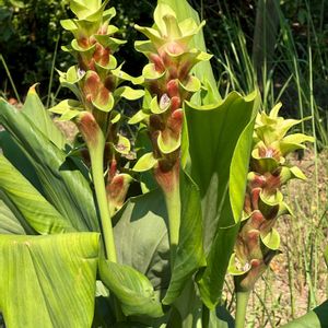 今日のお花 🌱ウコン 🌱 2024年9月4日 朝散歩にて ロウのような質感の苞葉、花は苞葉の隙間に小さな花が隠れるように咲いています。 ❷に蕾、開いたら黄色いです。 畑にウコン 毎年見ていますが、今年は行けませんでした。 もう花は終わっているでしょうね〜