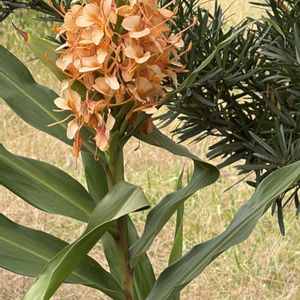 花は 夏から秋にかけて 穂状に咲きます🎶 背丈2mほど〰︎純白な花 良い香りがします🐽畑の花 ジンジャーリリー 別名 ハナシュクシャ ショウガ科