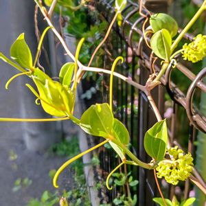サルトリイバラ 複数枚投稿 5枚 裏通りのフェンスに絡んだサルトリイバラ🌿 花芽が付いて、雄花か雌花か、咲くまで分からなかったけど、無事開花。 雌しべの頭柱が3裂、雌しべと判明。 数えたら12ケの花が咲いてる。 去年この場所で雄花が咲いたんだけど、剪定してしまったみたい。 来年に期待したいな。