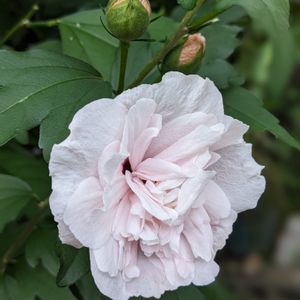 おはよう御座います〜☁☔ 雨が降らないうちに📸!! 裏庭に咲く大木八重ムクゲ 数十年前に挿し木… こんなに大きく成長!! 嬉しいなぁ〜 虫にも負けずに〜 優しそうな風合い〜 ママさんにピッタリ✌️😄 (う〜んフフフ…?) いいね\(^o^)/🙋💞