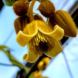 5℃(9:15) 晴れ☀️ 穏やかな朝です 黄金色のクレマチス 咲き始めました♡ 常緑冬咲きクレマチス(2〜4m) グレウィーフローラ(コンナータ系) Clematis grewiiflora