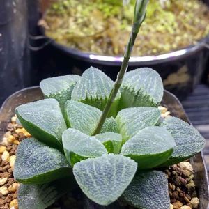 ハオルチア 軟葉系 エメリアエ 先週末の暖かさで花芽伸びてしまいました。😅 昨日今日は寒いので水遣りは控えてるから萎んでる 調子は悪くないです。😊