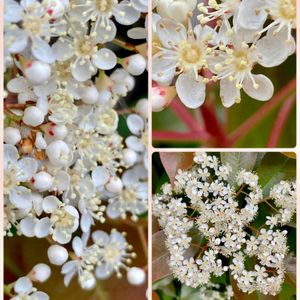 オオカナメモチが 彼方此方で咲いています。 赤い葉に白い花 丸い蕾が愛らしい💕🎶 古い時代の着物や帯の柄に ありそうな、、、 そんなお花に見えてきました〜