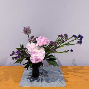 芍薬をいける時は、蕾を購入して和風にいけるのことが多いのですが、今回は開花している物で、ピンク〜紫色の取り合わせで洋風にいけてみました。
