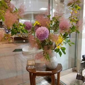 ピンクのスモークツリーとピンクのまんまるギガンジウムの生け花