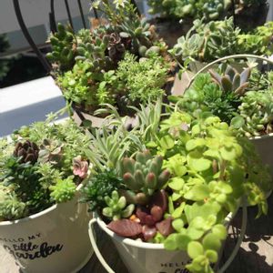 カットしたセダム多肉を100均の 小さなバケツや釣り籠に寄せました まだ入れたい気分ですが 暑くなるのでこのあたりで 止めておきます🍀🎶🌱🌸 GSの皆さんの真似をして 小さなジョーロも撮影に協力です😊
