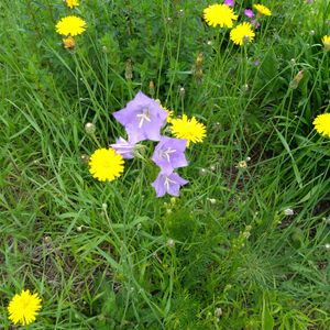🟣モモバキキョウ 花はキキョウに似て、葉はモモに似ているためこの名がつきました。キキョウとホタルブクロの中間のような花の形です。 ⚫︎キキョウ科 カンパニュラ属 ⚫︎原産 ヨーロッパ ⚫︎花期 5月〜7月