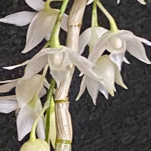 Den. hercoglossum var.alba 原種のデンドロビウム 花;2x2cm 涼しげな白花です。 ② 高芽取りして2年目。 株元が細いので下垂しますが、 整枝しないでそのまま育ててみ ました。