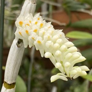 Den.purpureum v.alba 原種のデンドロビウム 白色で先端がポツンと緑色した小さな花が、球状にかたまって咲きます。 可愛いです。