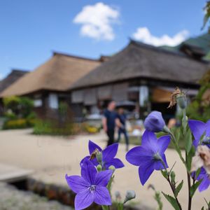 茅葺屋根の風景🌾とキキョウ🎆 江戸時代の民家が建ち並ぶこちらは 国選定重要伝統的建造物群保存地区に指定。 宿場の景観を残すために住民憲章の「売らない・貸さない・壊さない」の3原則を守り景観保存と伝統的な屋根葺きの技術習得、継承に取り組んでいます。 この日も暑かったですが、 すっきりと爽やかなキキョウが涼を感じさせてくれました。 キキョウは、自生しているものは少なくなり、環境省の絶滅危惧II類(VU)を受けています。 2023.7.17📷 福島県下郷町 大内宿にて 長男も添えて^^;