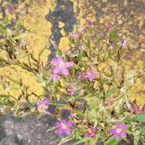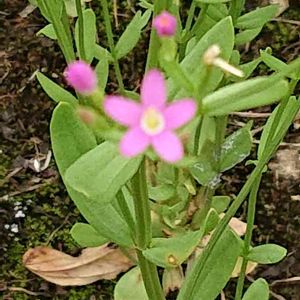 バス停の柱の影に 健気に咲いていました。 葉が枯れているのが多く、栄養失調のアカバナユウゲショウかと思ったのですが、花びらの数も違うし 何の花でしょうか? ちゃむさんに ハナハマセンブリと教えていただきました。