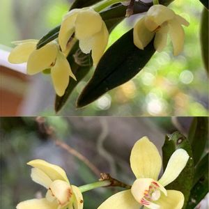 咲きました〜😆🙌🙌🙌 4/8に救済したカヤランがちゃんと咲きました🎶 拾った時、一瞬お風呂で…とも思いましたが、他のものと同じ条件なら着生していなくても咲くかもと🤔 巻き付けたツタ?も生きてたのね🌱😅 「カヤランの花芽」🏷をプチッとしていただくと4/8に飛べますから、是非そちらもごらんくださいね。 花芽は米粒大、膨らんだ蕾でも、左上のアイコンより小さいくらい😄ちっちゃいんです❣️