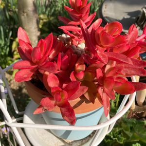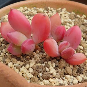 春になってもどんどん赤みを増している正体不明の葉挿しの多肉。うちにいる多肉には違いないけど,何の葉挿しかわからないまま。パキベリアっぽい。 エンジェルスフィンガーレッドかロジャージョーンズあたり?