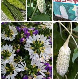 サンクエール💜🤍 葉が凄く茂ってるのになかなか実がつかないゴーヤ やっと実が付きました🎶簡単に出来ると思ってたけど調べてみたら違いました😅 親ツルには実がつかないので葉が5枚の所でカット✂️子ツルの葉も5枚でカット✂️らしいですね🙄 親ツルだけかと思ってたら子ツルもカット✂️…親ツルしかしなかったヮ…😅 雌花も雄花より少い…結構 実がつくには大変なのだ😣 でも何とか4本をゲット🎶 暑い時は苦味のゴーヤチャンプル〜😋 葉っぱが茂った中からシロゴーヤみっけ!シロゴーヤは苦味が少いらしい、まだ5センチ程 収穫が楽しみ🎶