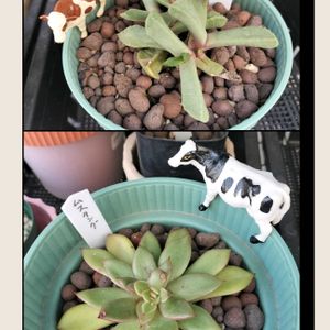 🏷️牛の日 ① 牛さんとお庭チェック お外で頑張っている多肉さん 桜波 ムスタング 新しい芽も出てる🌱🌱 🏷️今日のお花 カトレア 園芸総合センターの温室 ① ⬇️カトレア ⬆️エクメア ブルーシャンデリア ② エンシクリアタペンシス 黄緑色のお花が可愛い🍀