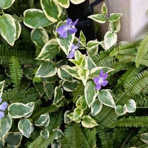 ツルニチニチソウの斑入りに花が咲きました 庭に根付いてからは冬の間は日影で雪も積もったりもするけど丈夫なんだね