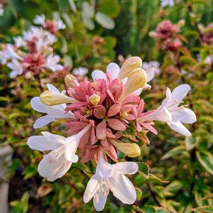 葉色が綺麗なアベリアに花が咲いて、華やかになりました🌿💚💛🌿 花弁が落ちて残ったピンクの萼片も、可愛いらしい花のようです✨🩷✨
