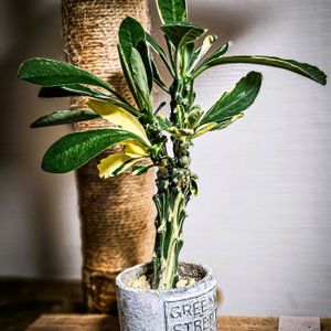 ユーフォルビア ネリーフォリア バリエガータ キリン角錦 キリン角錦は本体色が黄緑色のものが多い印象なのですが、この株は濃い緑で黄色い斑とのコントラストがシャープでお気に入りです。 今はちょっと生長お休み中ですが、春先から夏半ばまでぐんぐん育ってくれました。