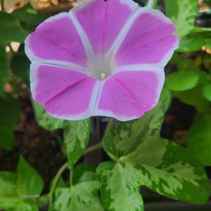 おはようございます😊 曜日咲 あさがお💠 🏷️2のつく日は斑入りの日 🏷️斑入り葉っぱ 🏷️ピンクワールドへようこそ 参加します。 今朝のベランダ 曜日咲の朝顔は半日咲いてると言われる様ですが果たして綺麗な姿をいつまで見せてくれるかなぁ……😃