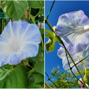 "水曜日は水色" 我が家のブルー系アサガオ。 種蒔き5年目の斑入り葉薄ブルー(①②)に、今年はミンちゃんからの贈り物桔梗咲き2種(④⑤)とご近所さんからいただいた空色(③)が加わり、庭が賑やかになりました。 📷️ 2025.7.15